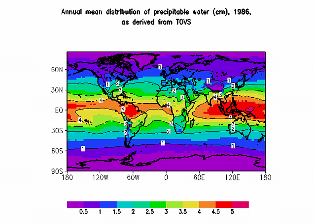 Figure 4. Annual mean distribution of precipitable water (cm) for 1986, as derived from TIROS Operational Vertical Sounder (TOVS).